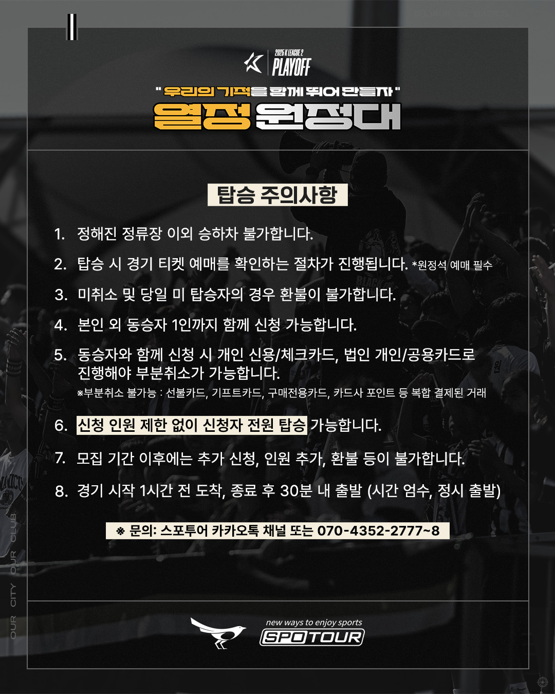 • 탑승 시 경기 티켓 예매를 확인 절차가 진행됩니다. (*원정석 예매 필수)