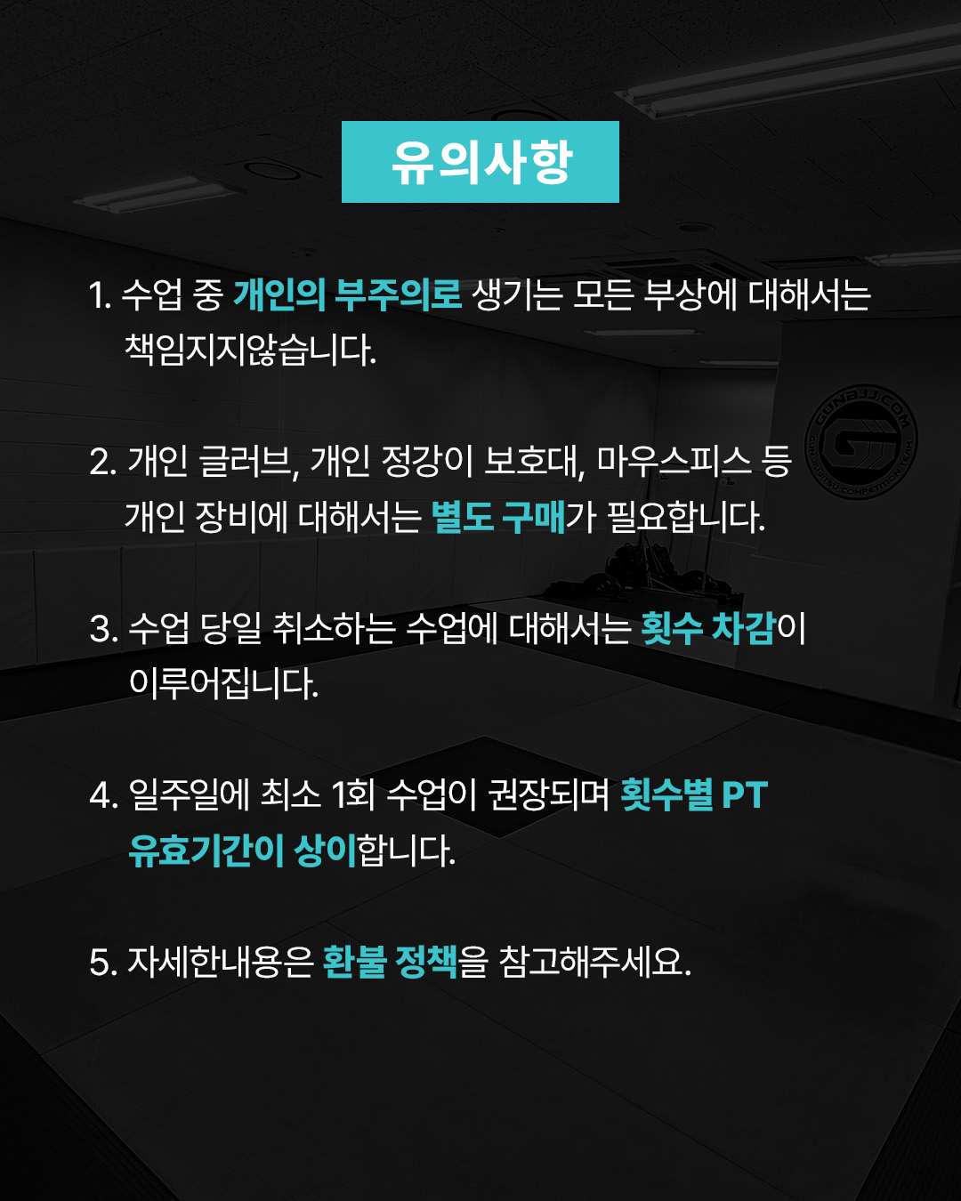 4. 일주일에 최소 1회 수업이 권장되며 횟수별 PT 유효기간이 상이합니다.